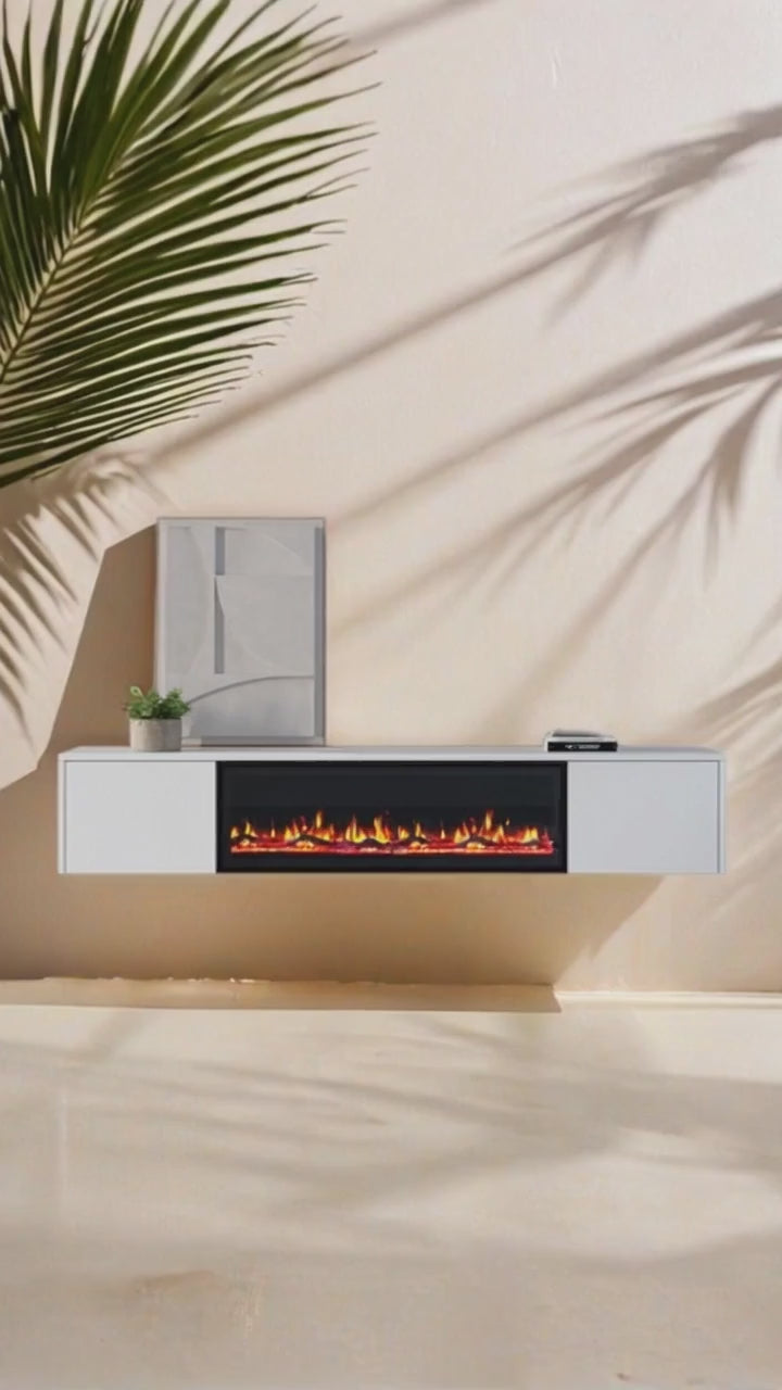 Het meubel is vervaardigd van hoogwaardig materiaal en afgewerkt in wit matte kleur voor een tijdloze look. De geïntegreerde elektrische haard (106 cm breed) beschikt over een realistisch vlameffect en een optionele verwarmingsfunctie die je naar wens aan of uit kunt zetten. Zo geniet je het hele jaar door van sfeer, met of zonder warmte.