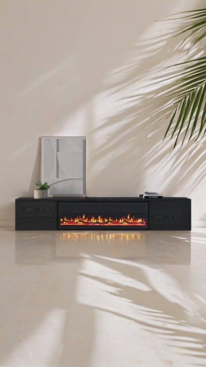 Het meubel is vervaardigd van hoogwaardig materiaal en afgewerkt in zwart eiken fineer voor een tijdloze look. De geïntegreerde elektrische haard (183cm breed) beschikt over een realistisch vlameffect en een optionele verwarmingsfunctie die je naar wens aan of uit kunt zetten. Zo geniet je het hele jaar door van sfeer, met of zonder warmte.