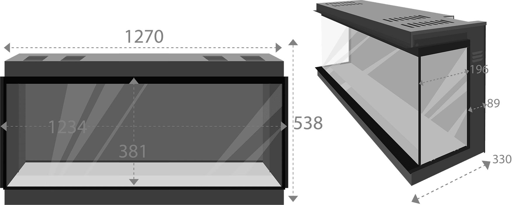 - 125, 150 en 200 cm uitgevoerd met een achterwand die schuin wegloopt. Wanneer je een van deze haarden in een hoek of 3-zijdig inbouwt heb je van de zijkant meer zicht hebt op het vuur.