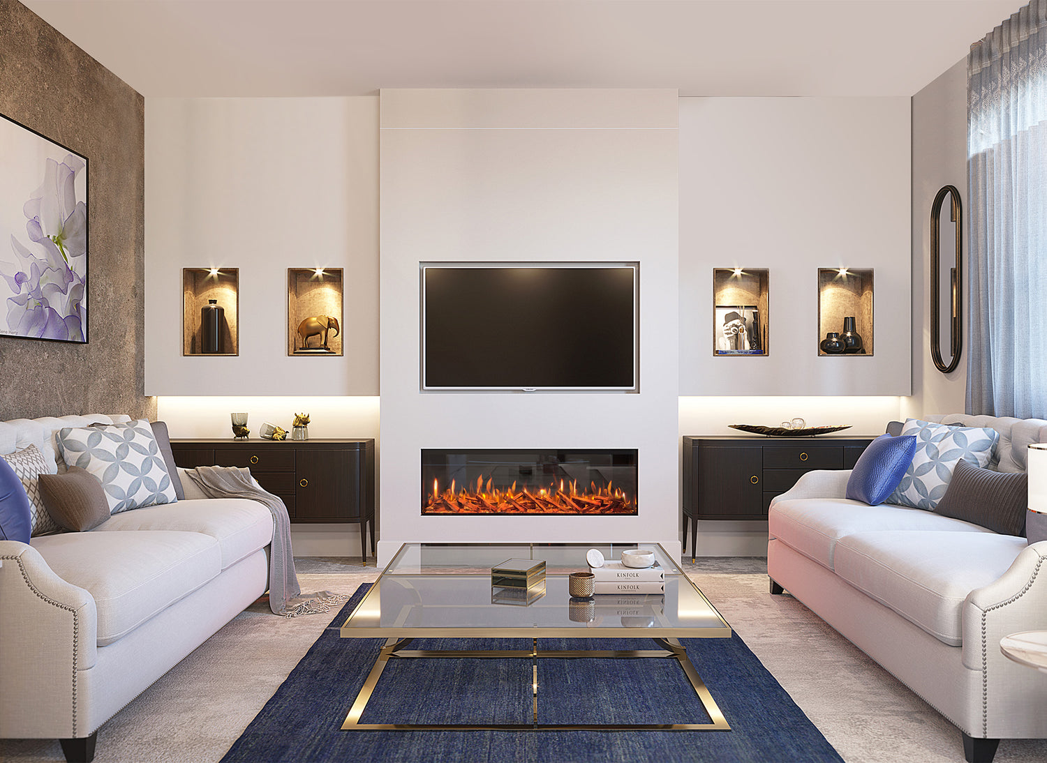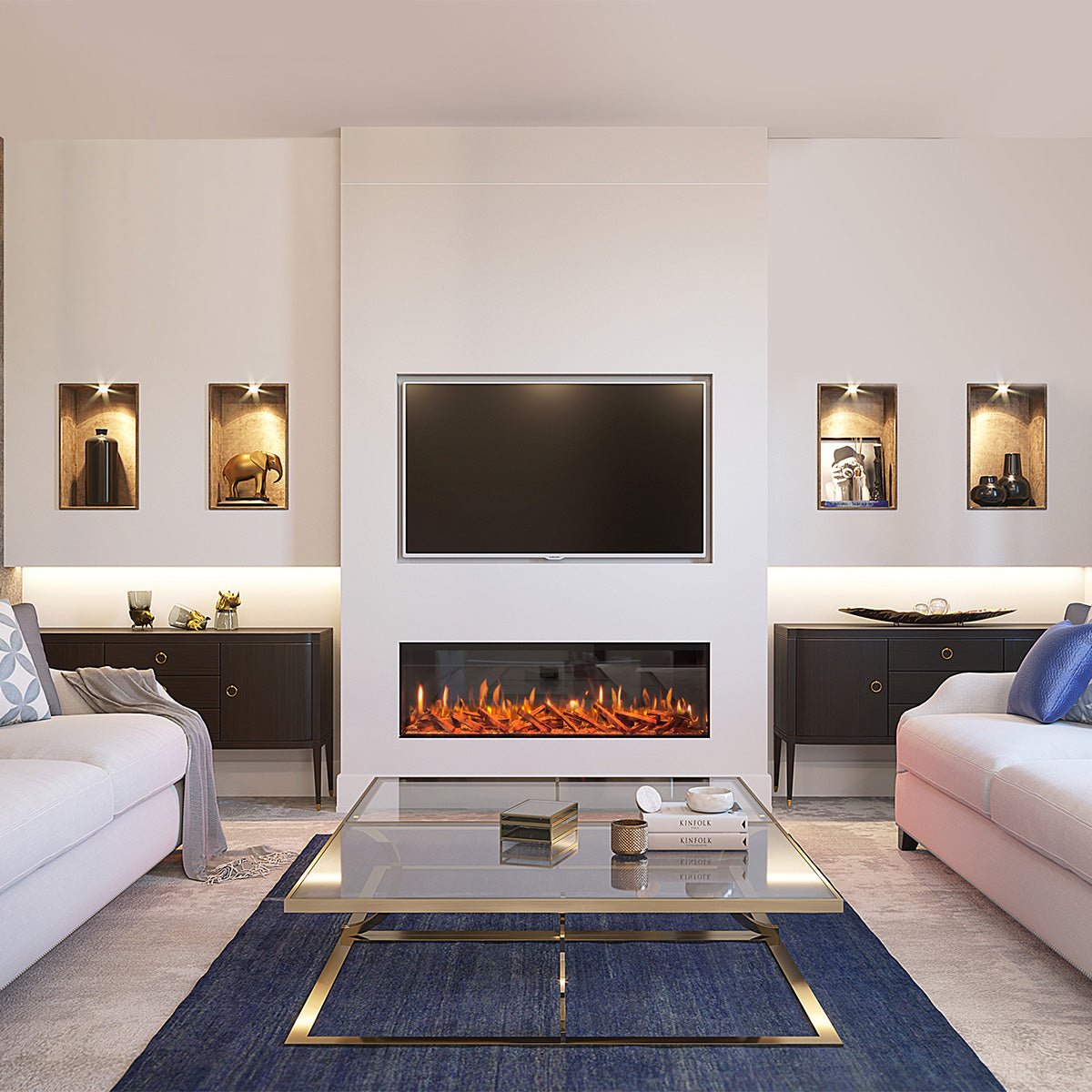 - Veelzijdig Ontwerp: Pas je haard aan aan je voorkeuren met drie verschillende installatieopties: frontaal, tweezijdig of driezijdig. Ongeacht je ruimte, integreert onze haard naadloos in je interieur en voegt een vleugje elegantie en warmte toe.