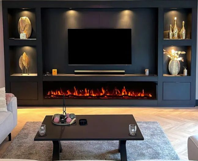 Een cinewall met elektrische sfeerhaard brengt warmte en design samen in één luxueuze wand. Je combineert het comfort van een haard met het gemak van moderne technologie. De haard zorgt voor een ontspannen sfeer, terwijl de televisie volledig geïntegreerd is in het ontwerp.