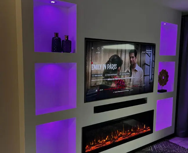 Altijd al gedroomd van je eigen thuisbioscoop? Met een cinewall van Sfeerhaardkopen wordt dat werkelijkheid. Haarscherp beeld, geen zichtbare kabels en een stijlvolle wand met geïntegreerde elektrische haard maken jouw filmavonden compleet. Ontspan, geniet en beleef je favoriete series en films in een warme, sfeervolle omgeving.