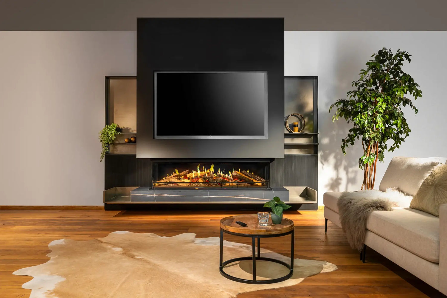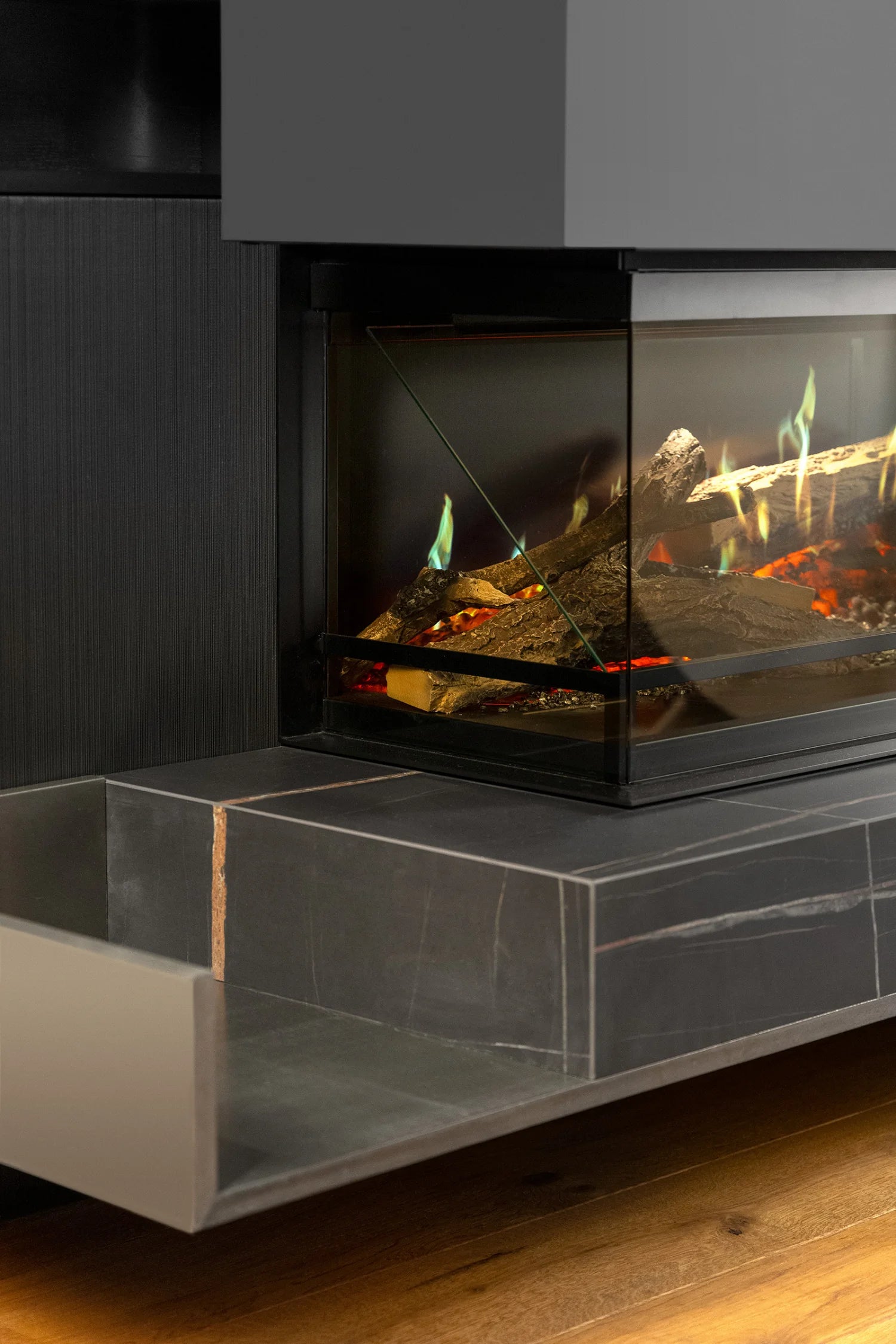 Een driezijdig model is geschikt als doorkijkhaard en tilt je interieur naar een hoger niveau. Bewonder het holografische vlammenspel door de zijkanten en laat je verbazen door het realistische vuur. De E-one 160S is met zijn breedte van 160cm ook perfect inzetbaar als cinewall. Kalfire E-one holografische sfeerhaarden kunnen worden aangepast aan persoonlijke voorkeuren. Onze exclusieve en gecertificeerde dealers zijn je helpende hand bij de installatie en realisatie van je droomontwerp.